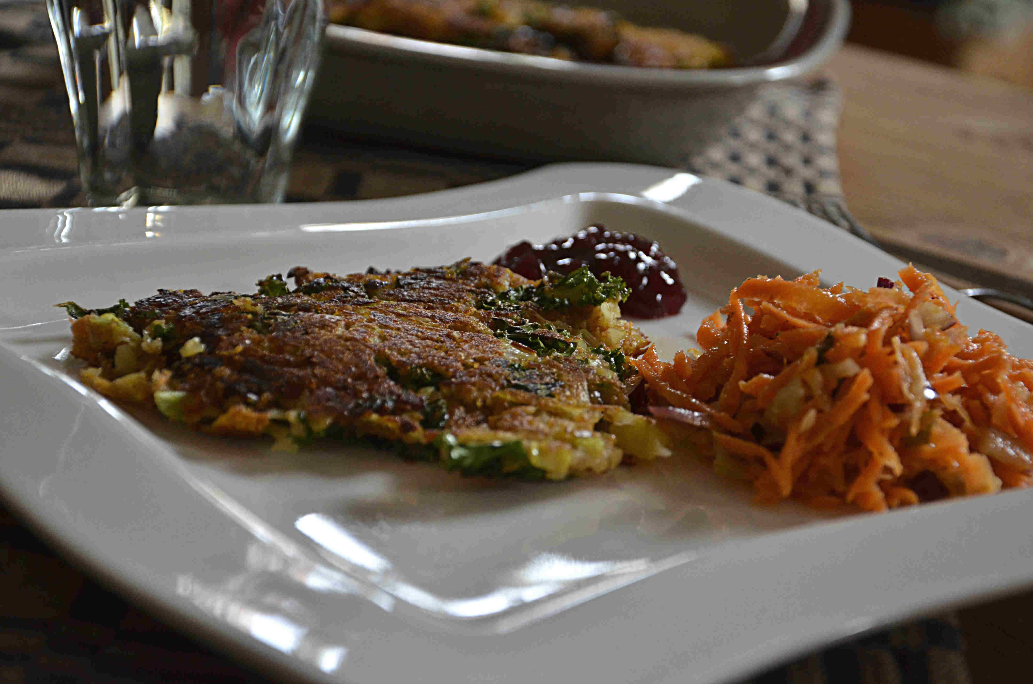 Nu i januari vill många laga både enkel och billig mat. Samtidigt behöver vi kanske piggas upp av mat som är nyttig och som upplevs en smula festlig. Denna vecka tipsar vi därför om en januarimeny med frasiga rotsaksplättar. Inspirerade av raggmunk, men med fler sorters grönsaker. Till dessa serveras en färgstark och fräsch sallad. Trots att det är slutet av januari har vi som odlare fortfarande möjlighet att skörda egen grönkål och purjolök. Dessa båda klippor i grönsakslandet har väl klarat av den snö som kommit. Skulle du själv sakna grönkål kan den säkert ersättas med exempelvis ekologisk fryst spenat eller något annat gott.