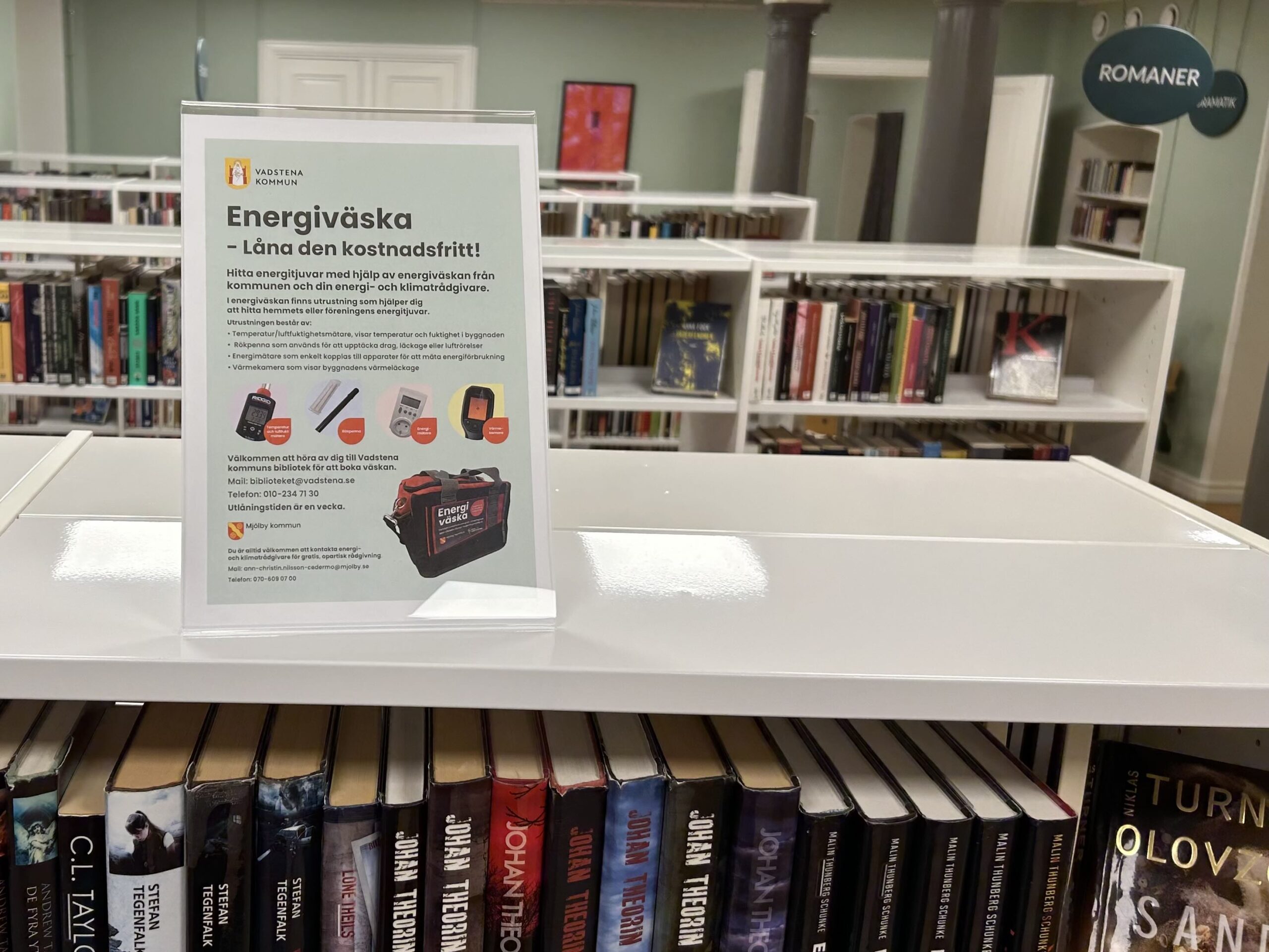 Gynna goda initiativ. Skylt i bibliotek om energiväska.